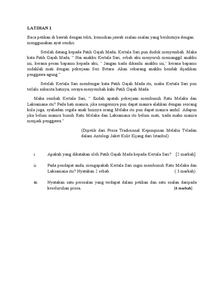 Kertas ModulSPM Kertas 2 Bahagian A - Soalan4 Set 1 Baca petikanbahasa Melayu Klasik di bawah ini asalnya dengan teliti. Dipetik daripada Kepimpinan Melalui Teladan Dalam antologi Jaket Kulit Kijang Dari Istanbul KPM Bahasa Melayu. LATIH TUBI BAHASA MELAYU STANDARD SET 1 - KEPIMPINAN MELALUI TELADAN ANTOLOGI JAKET KIJANG DARI ISTANBUL.